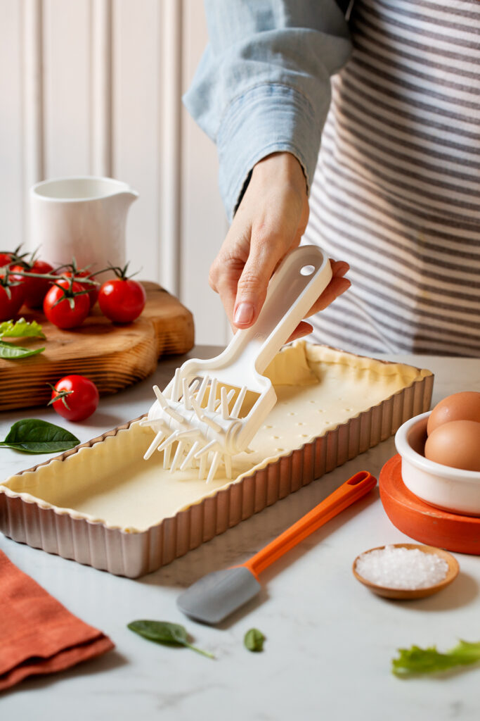Prendi una sfoglia di pasta brisée rettangolare già pronta e stendila leggermente, se necessario, per adattarla alla dimensione della tua teglia da crostata. Fodera lo stampo, ricoperto con un foglio di carta da forno e bucherella con il rullo bucasfoglia. Distribuisci qualche sfera di ceramica per la cottura in bianco. Cuoci in forno ventilato a 180°C per 10 minuti.