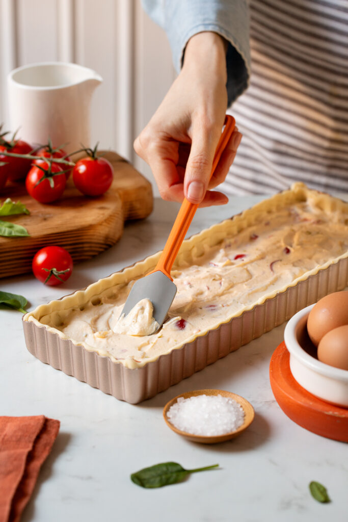 Togli la base dal forno e versa il composto di uova. Distribuisci i pomodorini sopra in modo uniforme. Continua la cottura in forno ventilato a 180°C per circa 35-40 minuti, fino a quando la superficie sarà dorata.