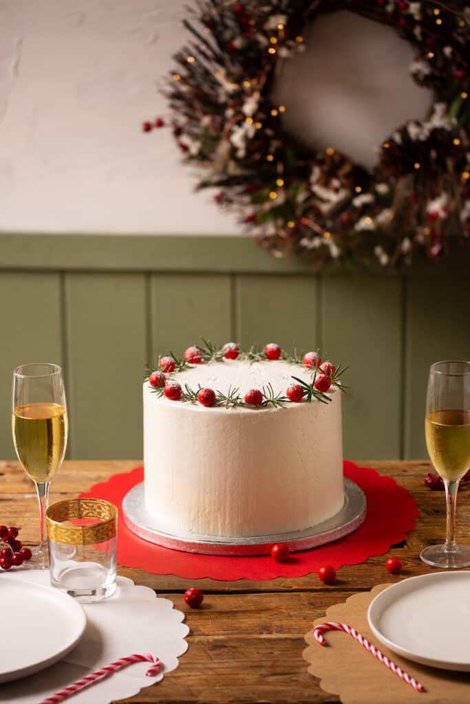 Una torta semplice con crema alla vaniglia e croccanti palline rosse decorative.