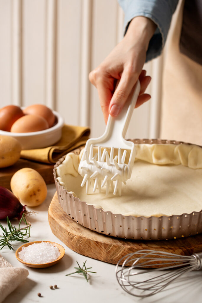 Prendi la pasta brisé già pronta e passaci sopra il nostro rullo bucasfoglie per creare i fori. Stendila leggermente e trasferiscila in una tortiera svasata (26 cm in superficie, 23 cm alla base, altezza circa 5 cm). Fai aderire bene la pasta ai bordi e rifila l’eccesso.