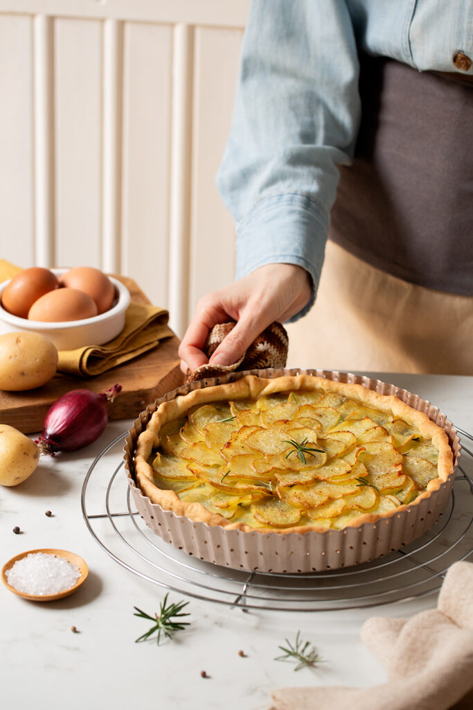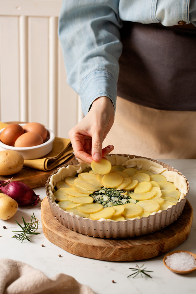 Versa il composto nella tortiera con la pasta brisé e livella la superficie. Scola bene le patate a fette, condiscile con sale, olio e pepe, e disponile ordinatamente sulla torta senza sovrapporle troppo. Spennellale con un filo d’olio. Completa con una macinata di pepe nero e qualche fogliolina di timo sbriciolato. Cuoci in forno statico a 180° per 60 minuti. Accendi poi il grill a 240° per 3 minuti, fino a ottenere una doratura uniforme.