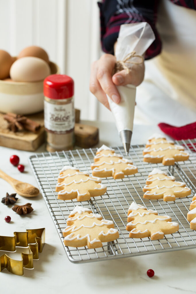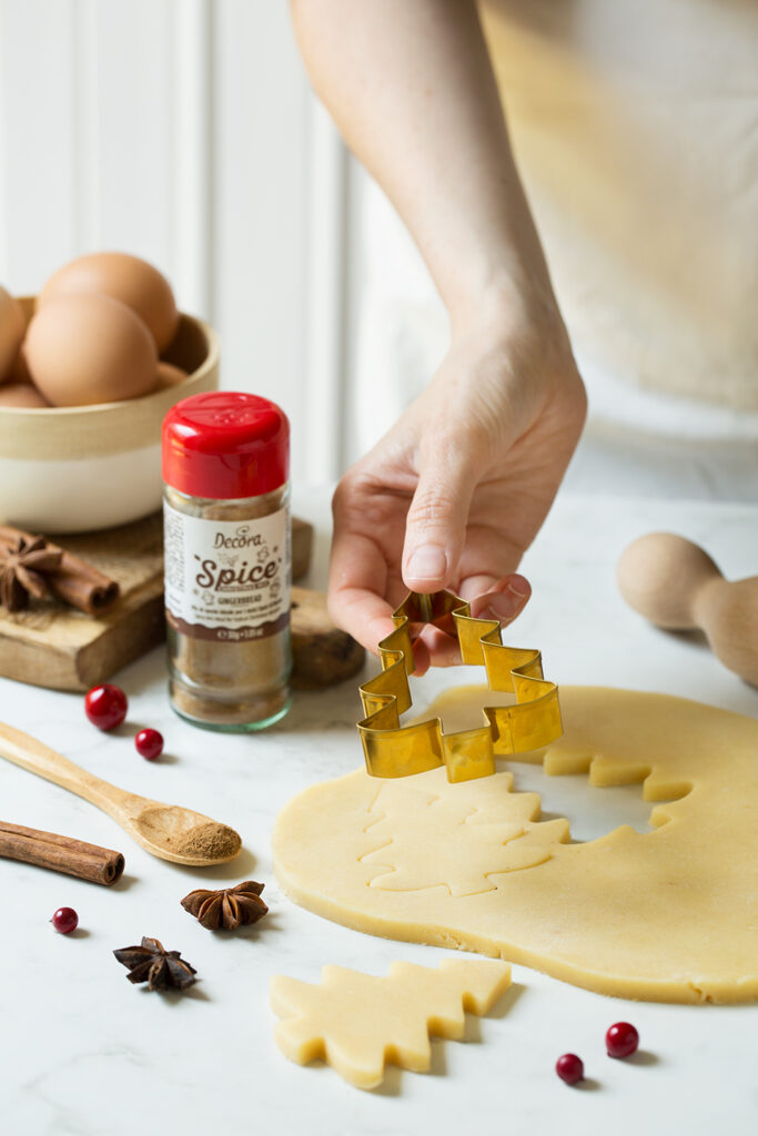 Inizia preparando i biscotti. In una ciotola versa la farina, lo zucchero a velo e un pizzico di sale. Aggiungi il burro tagliato a pezzetti e lavora velocemente il composto con le mani. Unisci le uova leggermente sbattute e impasta fino a ottenere un panetto morbido ed elastico. Avvolgilo nella pellicola e lascialo riposare in frigorifero per almeno un’ora. Stendi l’impasto con un mattarello su un piano leggermente infarinato e, con il tagliapasta a forma di alberello, ricava i biscotti. Cuocili a 180°C per 10–12 minuti.