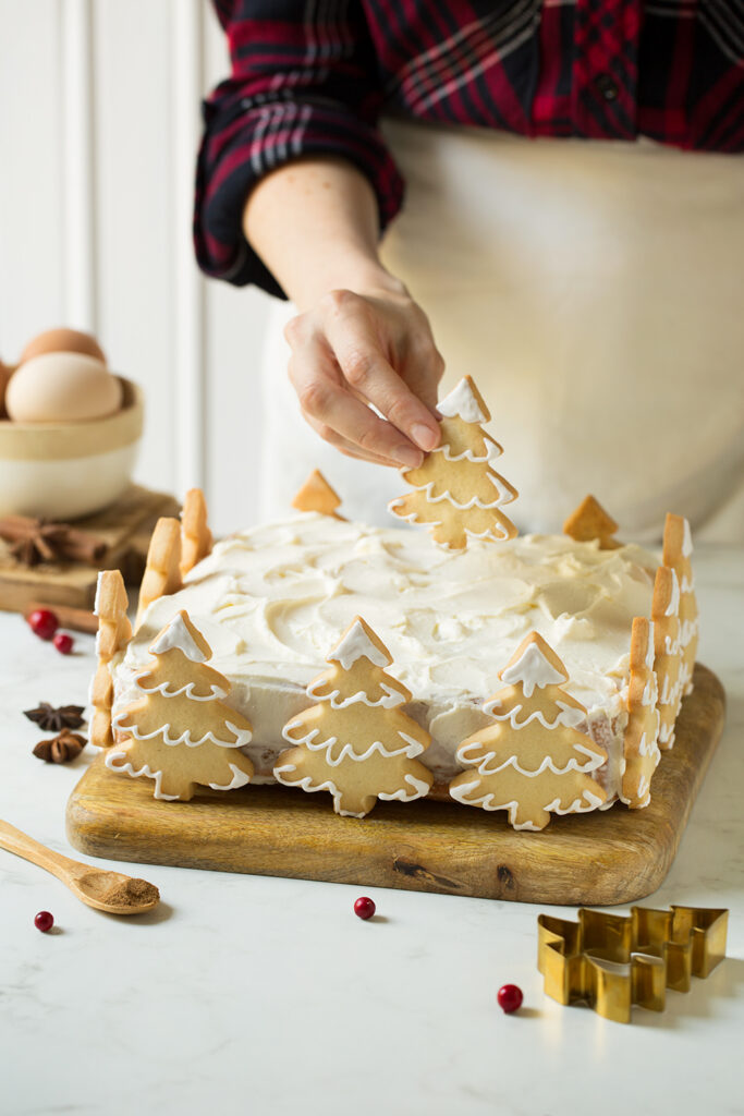 Aggiungi i biscotti: tre per ogni lato della torta e due in cima per decorare. Se vuoi, completa con alcune bacche di ribes o mirtilli rossi.