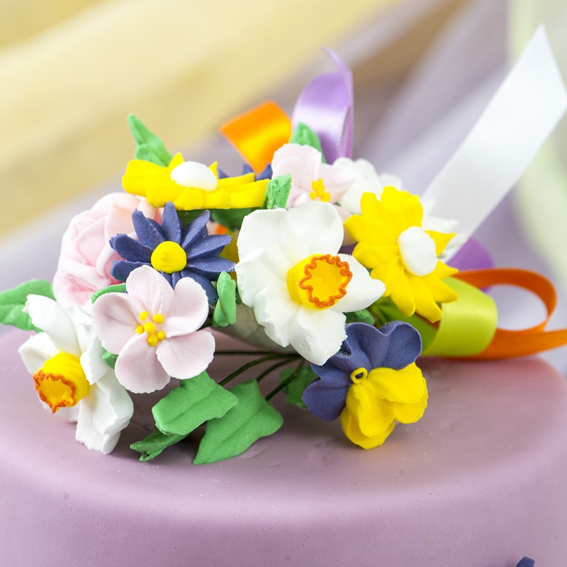 Per il Narciso, posiziona la sacca a 45° sullo spillo con il lato lungo del cornetto petalo rivolto verso il basso ed appena sollevato. Applica una costante pressione alla sacca e contemporaneamente ruota lo spillo così da formare 6 petali. Intingi le tue dita in un po’ di amido di mais o zucchero a velo e stringi i petali alle estremità per creare un effetto appuntito. Con il cornetto tondo liscio disegna la corolla del narciso; parti dal centro del fiore e realizza tre cerchi sovrapposti. Crea il pistillo con una striscia.