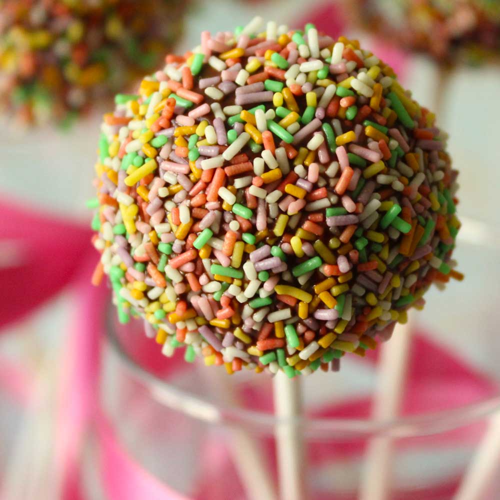 Tira fuori lo stampo dal frigo, sforma i cake pop, intingili in una ciotola con del cioccolato sciolto con la panna e subito dopo ricoprili con i bastoncini di zucchero colormix. Otterrai così un effetto Arcobaleno unico.