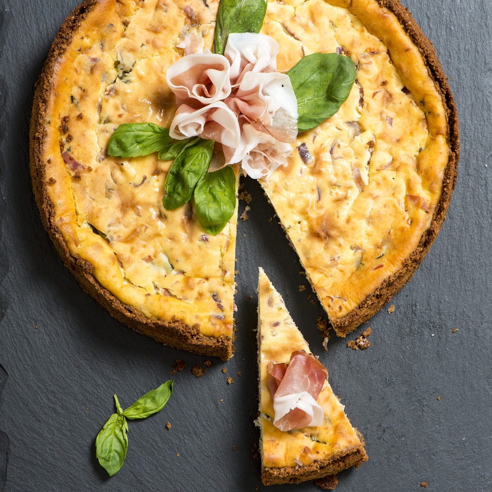 Rimuovi la crosta del pane e tostalo nel forno. Una volta freddo tritalo con 50 g di parmigiano, un pizzico di sale ed il burro fuso. Rivesti la base ed i bordi dello stampo a cerniera con la carta da forno. Versa il composto nello stampo, compattandolo con il dorso di un cucchiaio in modo che aderisca perfettamente ai bordi. Soffriggi in padella la cipolla con 2 cucchiai di olio evo e lo speck. Mescola la ricotta con lo yogurt, la farina, il resto del parmigiano ed un pizzico di sale e pepe. Aggiungi il soffritto e le uova leggermente sbattute. Mescola bene il tutto e versa il composto nello stampo. Inforna a 160° C per circa 1 ora. Sforna e servi la Cheesecake tiepida.