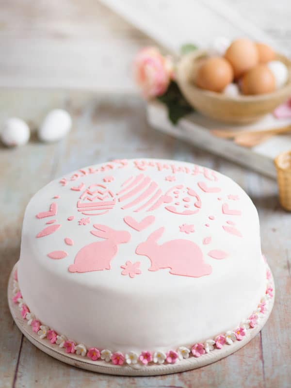 - Rivesti la torta con la pasta di zucchero bianca e con l’utilizzo dello stencil e della ghiaccia reale colorata, realizza la decorazione a tema pasquale.