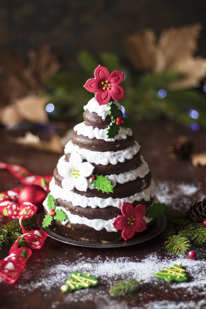 Cospargi l’albero facendo scendere intorno la ghiaccia reale dando l’effetto neve. Decora l’albero guarnendolo con le stelle di natale e gli agrifogli di zucchero.