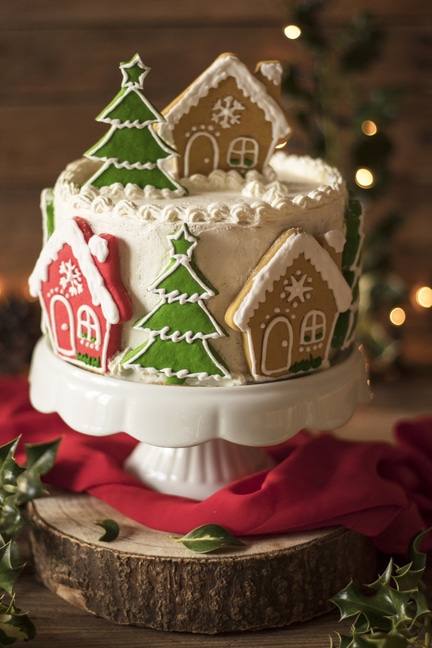 Sistema attorno alla torta le casette e gli alberelli, anche sulla superficie. Trasferisci la panna avanzata nella sac à poche munita di cornetto a stella e forma dei riccioli decorativi sui bordi della superficie della torta e alla base della casetta e albero. A piacere, spolverizza con zucchero a velo.