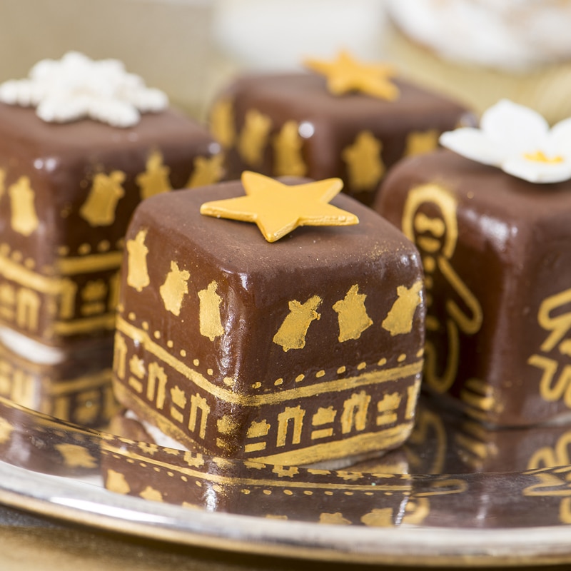 Monta il burro con lo zucchero per circa 10 minuti. Aggiungi le uova una alla volta, la farina ed il lievito setacciati, il sale ed infine l’Aroma. Versa l’impasto nello stampo imburrato ed infarinato ed inforna a 175° C per circa 45 minuti. Sforna e lascia raffreddare. Ritaglia l’impasto con il coltello in modo da ottenere le mini cakes. Farcisci con la Crema Spalmabile al Cacao e rivesti con la Pasta di Zucchero. Completa la decorazione utilizzando lo Stencil con il Perlescente e le Decorazioni in Zucchero.
