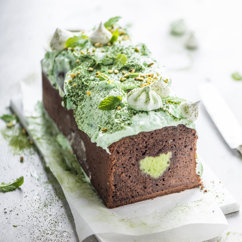 Preleva 8 cucchiai ben colmi di impasto e trasferiscili in una seconda ciotola. Aggiungi a questo secondo impasto qualche goccia di colorante alimentare verde. Stendi su una teglia ad un’altezza di 6-7 mm. Inforna a 170°C, forno statico per 10 minuti. Sforna e lascia raffreddare completamente.