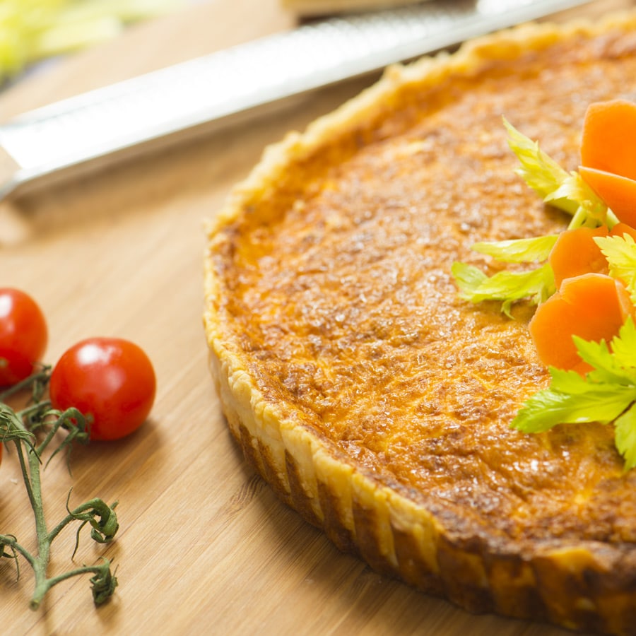 Mescola con il mixer la farina, il burro freddo ed una presa di sale fino ad ottenere una consistenza sabbiosa. Versa il composto in una ciotola ed aggiungi l’acqua. Lavora con le mani fino ad ottenere un panetto morbido. Ricoprilo con della pellicola trasparente e lascia riposare in frigo per circa 40 minuti. Infarina il piano di lavoro e stendi, con l’aiuto di un matterello, la sfoglia fino ad ottenere una superficie abbastanza ampia da ricoprire il fondo della teglia. Rivesti la teglia, precedentemente imburrata ed infarinata, in modo che la sfoglia aderisca perfettamente anche sui bordi laterali. Taglia con la rotella la pasta in eccesso e con il rullo bucasfoglie fora il fondo della crostata per evitare rigonfiamenti. Inforna a 190° C per circa 15 minuti in forno preriscaldato. Prepara il ripieno montando in una ciotola l’uovo e i tuorli con la panna; aggiungi un pizzico di noce moscata, pepe e sale e mescola il tutto fino ad ottenere una consistenza cremosa. Cuoci la pancetta a dadini per circa 10 minuti in acqua bollente, scolala e tienila da parte. Trascorsi i 15 minuti di cottura sforna e lascia raffreddare. Spennella il fondo con dell’albume montato a neve e poni nuovamente in forno per circa 5-10 minuti a 170° C, fino a che il fondo della torta diventi ben dorato. Lascia raffreddare. Cospargi il fondo della quiche con il groviera grattugiato e ricopri con il composto di uova e panna montata. Aggiungi i dadini di pancetta affumicata ed inforna a 170° C per circa 15-20 minuti. Lascia riposare per circa 10 minuti prima di servire.