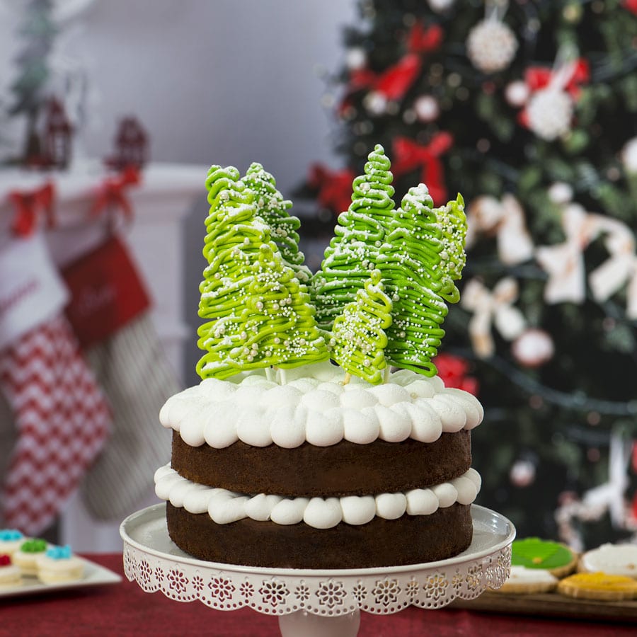 Decora gli alberelli con le decorazioni di zucchero pronte all’uso e spolverizza con lo Zucchero a Velo Resistente all’Umidità.