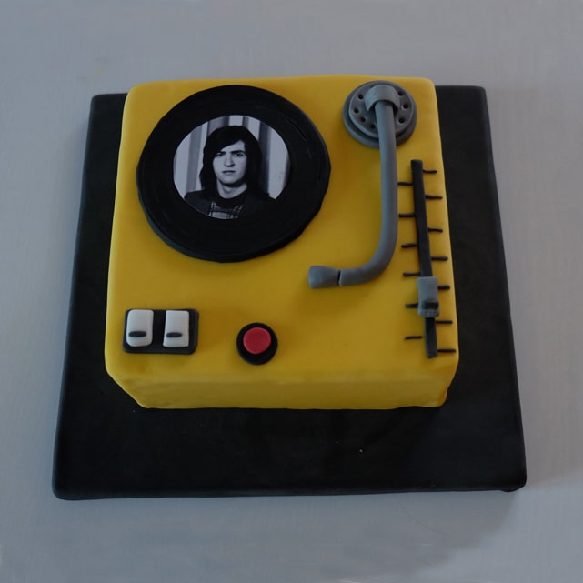 Realizza un cerchio di pasta di zucchero nera ed incidilo leggermente all’interno, in modo da creare cerchi di dimensioni differenti. Ritaglia una fotografia, oppure utilizza un foglio di ostia stampato.