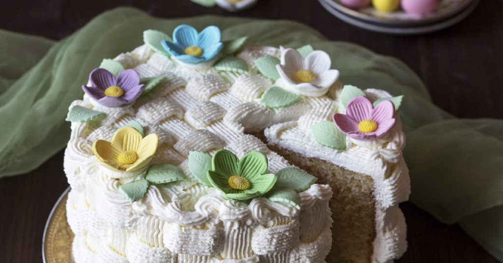 - Decora la torta primavera posizionando i fiori assortiti e le foglioline intorno ai bordi.