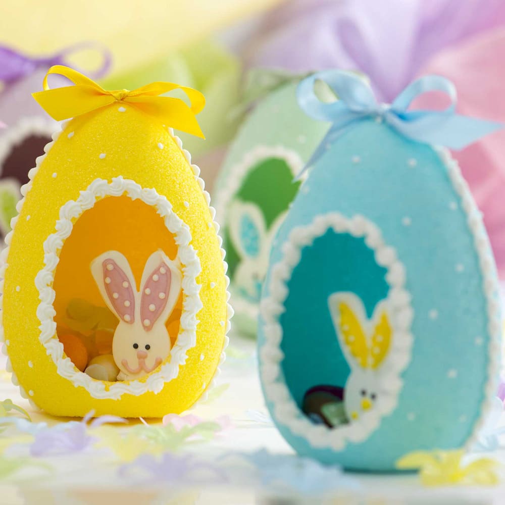 Posiziona ora le decorazioni in zucchero pronte all’uso all’interno delle cavità ottenute. Con i nastrini doppio raso, realizza delle piccole coccarde da applicare sull’uovo.